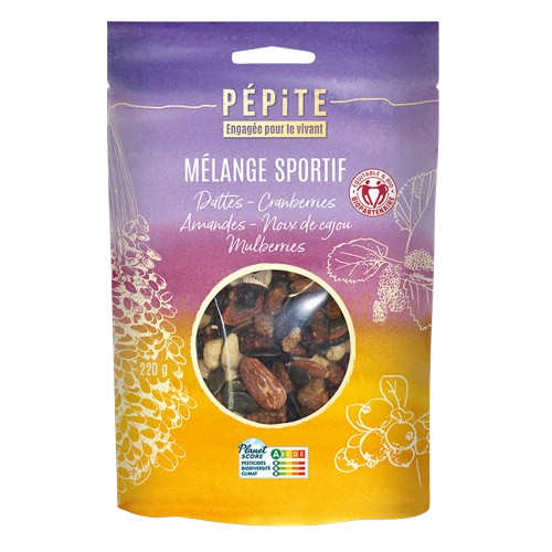 Notre mélange est composé de fruits secs et fruits à coques de diverses origines. 74,9% des ingrédients de ce mélange sont issus du commerce équitable contrôlé selon les référentiels Fair For Life et FiABLE.