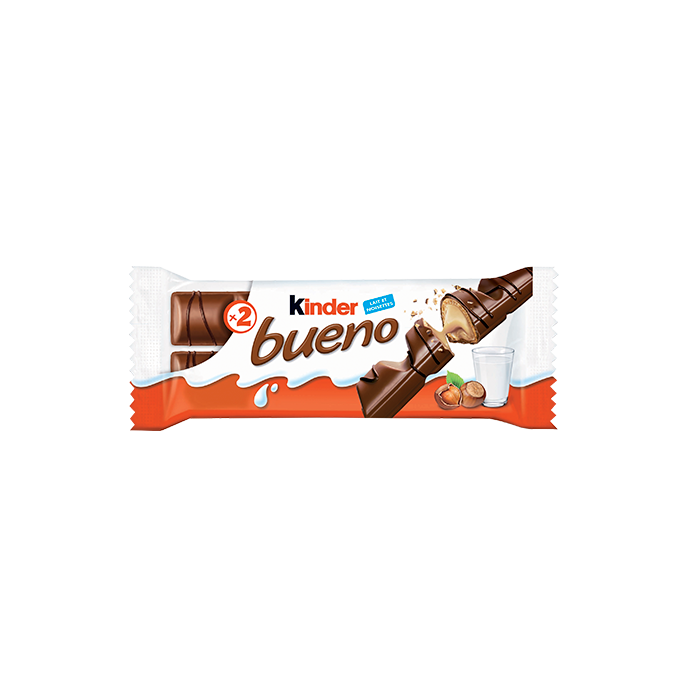KINDER BUENO c'est une barre délicieusement chocolatée au bon cœur au lait et aux noisettes.