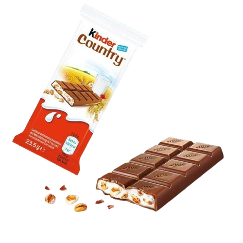 Boite de 24 étuis de 2 Kinder Country. Une barre enrobée de bon chocolat au lait, avec 5 céréales (orge, riz, froment, épeautre, sarrasin), KINDER COUNTRY apporte la juste dose d'énergie dont les jeunes enfants ont besoin, sans couper l'appétit.