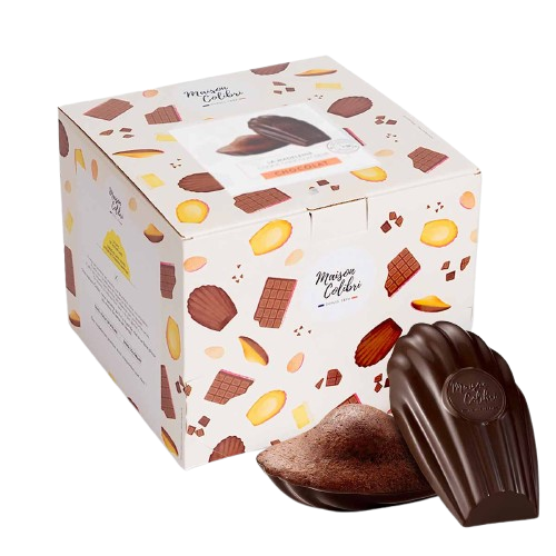 Recette unique et déposée, la coque en chocolat est la marque de fabrique de la Maison Colibri. Les madeleines sont moulée dans du chocolat au lait ou noir et composées de plus de 30% de chocolat. La coque en chocolat est épaisse et croquante.