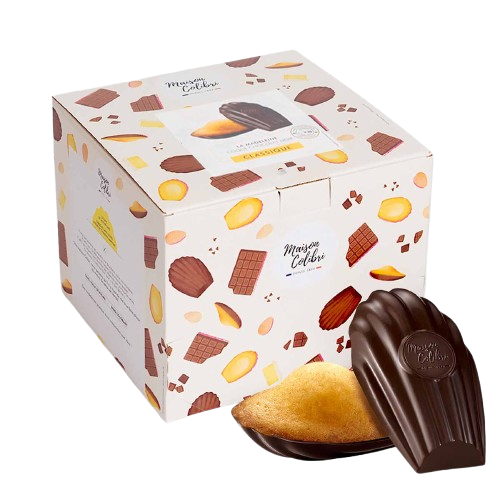 Recette unique et déposée, la coque en chocolat est la marque de fabrique de la Maison Colibri. Les madeleines sont moulée dans du chocolat noir et composées de plus de 30% de chocolat. La coque en chocolat est épaisse et croquante.