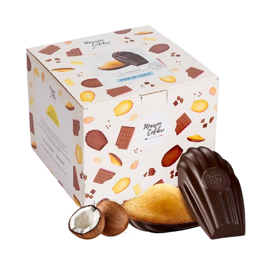 Recette unique et déposée, la coque en chocolat est la marque de fabrique de la Maison Colibri. Les madeleines sont moulée dans du chocolat au lait ou noir et composées de plus de 30% de chocolat. La coque en chocolat est épaisse et croquante.