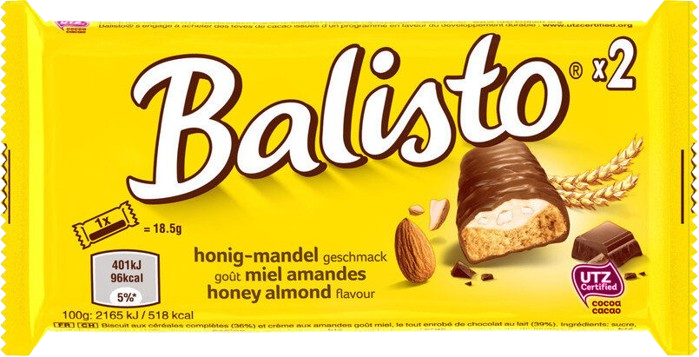 Biscuit à la farine complète, crème au miel et amandes, enrobé de chocolat au lait (39%). Boîte de 20 barres (paquet jaune).